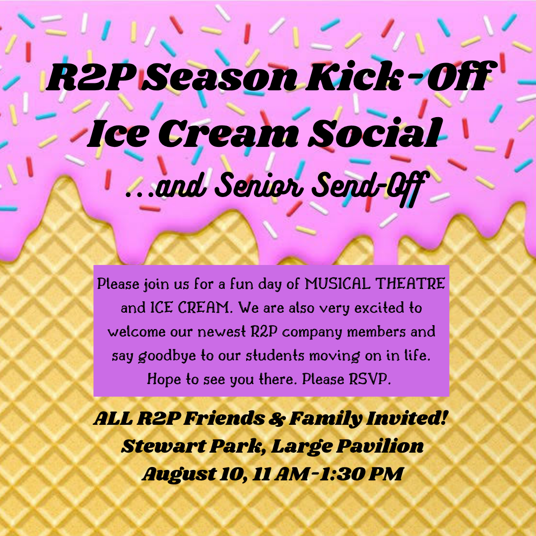 Please join us for a celebration of MUSICAL THEATRE and ICE CREAM. We are excited to welcome our newest R2P company members and say goodbye to our students moving on in life.